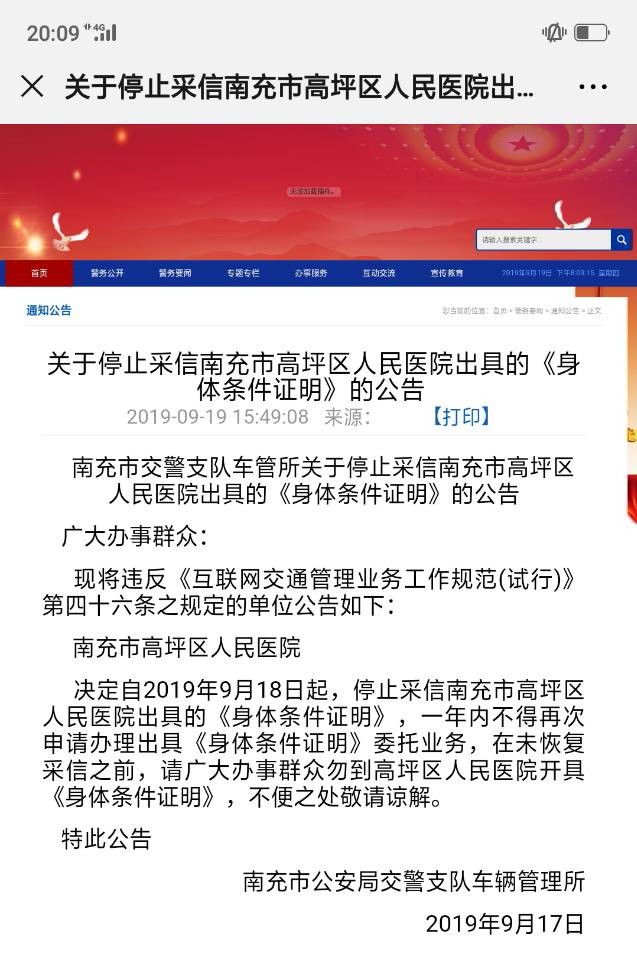 各位看官! 就在今天下午下班的时候, “瞭望者Y”从“南充市公安局交通警察支队—南充交警网”上看到了这样一条信息—— 对了! 看不清楚哈? 看不清楚也莫得关系—— 这上边说的是, 咱们南充大市那边的交警支队 以“公告”、公文的方式在网上公开向社会表明:他们停止采信高坪那边的区人民医院出具的《身体条件证明》了! 对了! 要是亲们还没法看清楚的话, “瞭望者Y”这就来把“警方”的这条重要公告一字不漏地附在后边, 让正在看手机的亲们看个“清清楚楚·明明白白·真真切切”—— 附:公告全文 南充市交警支队车管所关于停止采信 南充市高坪区人民医院出具的 《身体条件证明》的公告 广大办事群众: 现将违反《互联网交通管理业务工作规范(试行)》第四十六条之规定的单位公告如下: 南充市高坪区人民医院 决定自2019年9月18日起,停止采信南充市高坪区人民医院出具的《身体条件证明》,一年内不得再次申请办理出具《身体条件证明》委托业务,在未恢复采信之前,请广大办事群众勿到高坪区人民医院开具《身体条件证明》,不便之处敬请谅解。 特此公告 南充市公安局交警支队车辆管理所 2019年9月17日 怎么样? 这样看来—— 咱们南充交警这次是“惹火”了! 这次是“较真”了! 当然了! 尽管“警方”在公告上没有把事情的来龙去脉给“抖”清楚! 但是, “瞭望者Y”坚信: 这世界 “永远没有无缘无故的爱、也没有无缘无故的恨”! 所以的所以, “瞭望者Y”坚定地相信—— 这应该是“高坪区人民医院”失信在先! 坚定地相信—— 这应该是咱们南充交警公开亮剑“公对公”地给予了“高坪区人民医院”一次“惩戒”! …… 对了! 对于这样的“一纸公告”, 南充的媒体都只是“默不作身”在给予转发! “瞭望者Y”不才, 没法压抑住自己看到这条消息以后的激动心情! 于是的于是, 在给微友们分享这条信息的时候, 也不由自主“下意识”地要对南充交警的这种行为给予几句评说、给予两句赞赏! 你想嘛! 要是我们身边的每一个单位跟部门都能“像南充交警”这样“公对公”、“官对官”地“正儿八经”来相互监督、相互制约、相互较真、相互按照“正规程序”你来我往办事,又何愁社会风气的好转呢? 所以的所以, “瞭望者Y”今儿个对南充交警的做派, 那肯定是佩服得“五体投地”了! 所以的所以, “瞭望者Y”要在这儿发自内心地给咱们南充的交警一个大大的点赞!!! 当然了! 尽管这“事情”发生在咱们南充的高坪! 尽管这“事情”是因为“高坪区人民医院”惹起! 但是, 在“瞭望者Y”这“榆木脑壳”看来—— 咱们南充、乃至咱们南充嘉陵这边的“官方”, 也应该从这件事上借鉴和深思到很多的“东东”! …… 当然了! “瞭望者Y”更加希望在今后的日子里—— 更多地看到南充的官方“如此这样、这样如此”地“公对公”较真! 希望更多的看到这种“公对公”的制约来促进社会的进步!